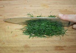 Промываем укроп под проточной водой, отряхиваем от лишней жидкости и выкладываем на разделочную доску. С помощью ножа мелко рубим зелень и пересыпаем в свободное блюдце. Внимание: для украшения салата нам понадобится буквально одна веточка укропа.