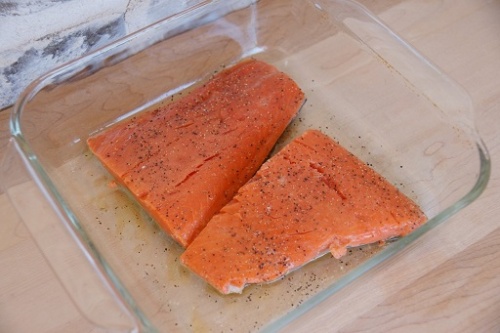 - Красную рыбу для салата можно использовать любую. Учитывайте, что семга жирнее других видов. На мой вкус, идеально подходит форель. Итак, разогреваем духовку до 200 градусов. Выкладываем филе красной рыбы в форму, солим, перчим, сбрызгиваем оливковым маслом и ставим запекать. Через 15-20 минут рыба будет готова.