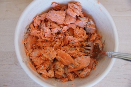 - Вынимаем рыбу из духовки и оставляем остывать. Затем снимаем кожу, филе перекладываем в миску и измельчаем вилкой.