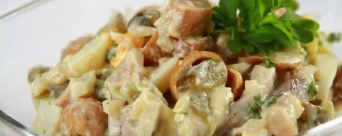 Приготовьте сытный салат ‘Рыбка’ с сельдью и шампиньонами. Пошаговый процесс с деталями и рекомендациями поможет