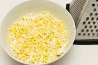 Берем 2-3 куриный яйца и кружку вместительную эмалированную. Кладем яйца в кружку, наливаем холодной воды в нее, засыпаем 1-2 чайных ложек соли и 1 чайную ложку уксуса, если он есть. Все это ставим на большой огонь и когда вода в кружке закипит, делаем огонь умеренным и варим яйца минут 10-12. Соль и уксус мы добавляли для того, чтоб в процессе варки яйц — они не потрескались. Когда яйца будут сварены — ставим их прямо в кружке под проточную холодную воду, ждем 2-3 минуты, чтобы они полностью остыли, чистим их от скорлупы и натираем их на терке. Часть и желательно большую советую оставить для украшения торта.