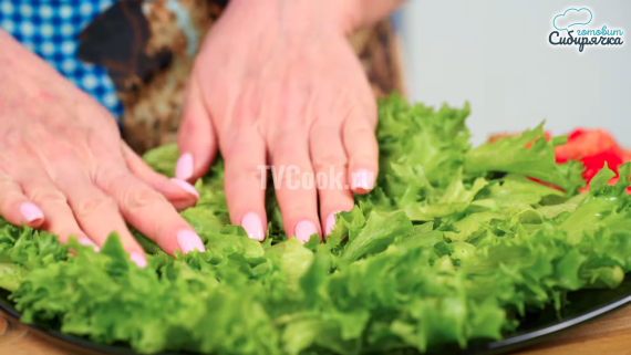 Нарываем кусочками 180 гр. листьев салата, которые предварительно промываем и сушим, затем выкладываем их на блюдо и слегка прижимаем руками.