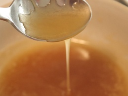 Выкладываем мед в сотейник и ставим на маленький огонь. При постоянном помешивании столовой ложкой, доводим мед до жидкого состояния. Сразу же после этого выключаем конфорку, а емкость отставляем в сторону остывать до комнатной температуры.