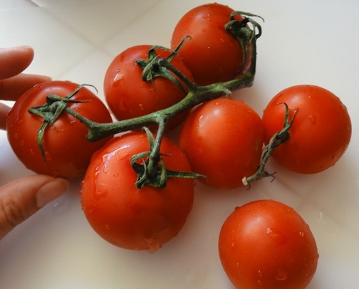 Помидоры тщательно промойте, для достижения лучшего результата воспользуйтесь мягкой губкой. После насухо протрите овощи бумажными полотенцами. Разрежьте каждую помидорку на четыре равные части, точно так же, как и копченые яйца.