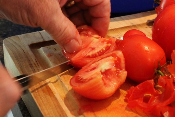 Свежий помидор тщательно промойте под струей воды и обсушите бумажным полотенцем. Обязательно вырежьте белесое уплотнение, а после накрошите овощ тонкими ломтиками — дольками.