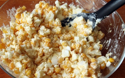 – перед приготовлением салата полезно провести ревизию в холодильнике. Кукуруза и яйца — базовые ингредиенты, которые можно смело дополнять. Может быть, у вас остался неприкаянный кусочек сыра или ветчины, чудесно, все в салат;