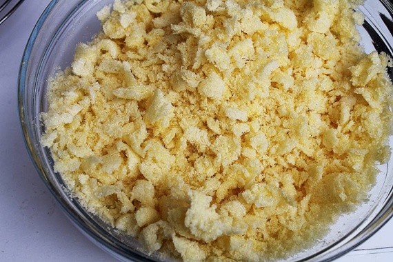 - Сперва высыпьте половину кукурузных палочек, полейте их 6-7 столовыми ложками ледяной воды. Воздушные палочки быстро намокнут и начнут оседать. Тогда высыпьте к ним остальные и точно так же полейте их сверху водой. Когда все палочки намокнут, взбейте их блендером до однородной массы.
