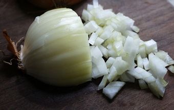 При помощи кухонного ножа очищаем лук от шелухи и промываем его под теплой проточной водой. Затем перекладываем овощ на разделочную доску и нарезаем на небольшие квадратики. Измельченный лук перекладываем в свободную миску.