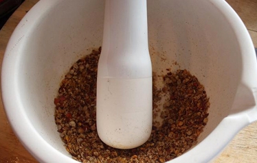 Оказывается, семена горчицы тоже оказывают положительное влияние на наш организм. Например, они дают нам витамины группы В, а такие минералы, как кальций, железо, цинк и магний, поддерживают иммунную систему. Так что даже в таком маленьком зернышке есть столько всего полезного! Только добавлять семена горчицы в пищу нужно в умеренном количестве, так как в сухом состоянии они практически не пахнут. Но стоит их перемешать с жидкостью, вы сразу же почувствуете их острый вкус. Итак, выкладываем несколько зерен горчицы в ступку и вручную измельчаем эту приправу.