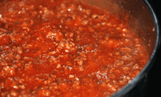 В сковороду или сотейник вливаем немного оливкового или растительного масла и ставим ее на средний огонь. Разогреваем ее, после чего добавляем нарезанный лук и, периодически помешивая, обжариваем его до легкого золотистого цвета. Добавляем размороженный фарш и продолжаем жарить ингредиенты. Через 4-5 минут добавляем нарезанные помидоры и измельченный базилик. Накрываем крышкой наше блюдо и тушим на медленном огне 30 минут. Не забывайте периодически помешивать соус и смотреть, чтобы он не пригорел. По необходимости можно добавлять немного кипяченой воды. За 5 минут до выключения соуса солим его по вкусу и перчим.