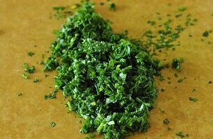 - Зелень встряхните, удаляя влагу, и мелко нарежьте на разделочной доске.