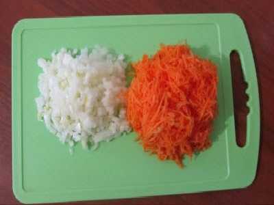 Берем морковь, тщательно моем ее под холодной водой и очищаем ножом от кожуры, затем, еще раз ополаскиваем. Трем морковь на средней терке. Откладываем ее в сторону. Репчатый лук чистим, ополаскиваем под водой и мелко измельчаем ножом на разделочной доске. Далее, берем небольшой пучок петрушки и моем под холодной водой. Слегка встряхиваем его от воды и измельчаем ножом на разделочной доске.