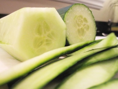 Чашу блендера промываем и сушим бумажными кухонными полотенцами. Промываем под проточной водой огурцы, салатные листья, пучок укропа и петрушки. Сушим овощи бумажными полотенцами, а зелень встряхиваем над раковиной от лишней воды. Чистим от кожуры огурцы, разрезаем их на 4 – 5 частей и отправляем в чистую чашу блендера.