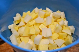 - Пока главный компонент варится, воспользовавшись острым кухонным ножом, очищаем от кожуры все овощи, указанные в рецепте. Затем промываем их, сушим бумажными кухонными полотенцами, по очереди выкладываем на разделочную доску и измельчаем. Картофель нарезаем небольшими кубиками величиной от 1,5 до 2 сантиметров, скидываем в чистую глубокую посуду, заливаем холодной водой выше на 2–3 пальца и оставляем в таком виде до использования, чтобы не потемнел.