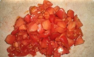 - Промойте помидор, сделайте неглубокий надрез на коже, обдайте кипятком и снимите кожицу. Нарежьте кубиками 1х1 см.