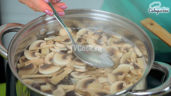 Наливаем в поставленную на плиту кастрюлю 2 литра воды и выкладываем в нее оставшуюся половину шампиньонов, затем прикрываем кастрюлю крышкой и доводим воду до кипения на большом огне плиты.