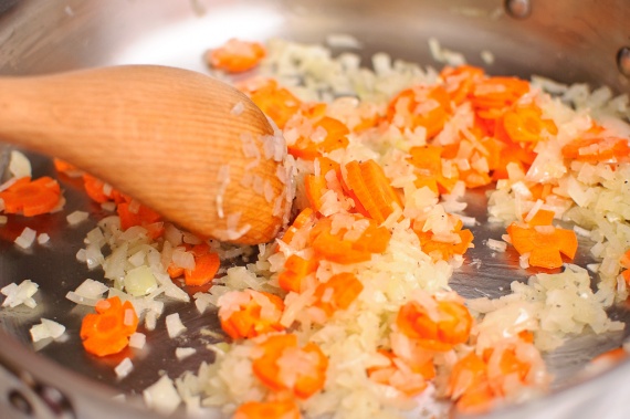 - Затем в сковородку к луку высыпьте цветочки из морковки и жарьте все постоянно помешивая до тех пор, пока овощи не размягчаться и слегка не изменят цвет. Пока морковь и лук готовятся, можно переходить к следующему этапу.