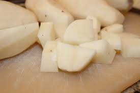 С помощью ножа очищаем картофель от кожуры и после — тщательно промываем под проточной водой. Выкладываем овощ на разделочную доску и нарезаем на крупные кусочки. Измельченный компонент перекладываем в глубокую тарелку и заливаем полностью холодной водой из-под крана, чтобы картофель не потемнел, пока мы будем готовить грибы.