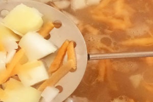 - Если мясо готово, при помощи шумовки перекладываем его в чистую глубокую тарелку и даем возможность полностью остыть возле приоткрытого окошка. Тем временем сливаем с картофеля воду, отправляем его в бульон вместе с луком и морковью и варим овощи на среднем огне 15 минут, периодически помешивая.