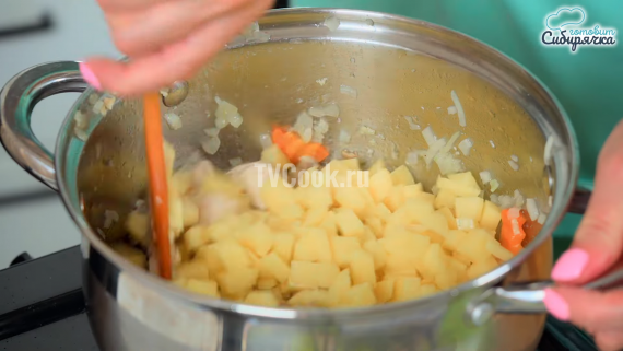 Нарезаем мелким кубиком 2-3 картошки которую затем выкладываем в общую кастрюлю и перемешивая все ингредиенты продолжаем их обжаривать.