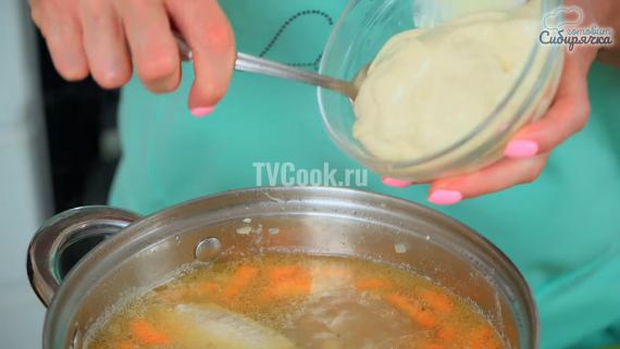 - Продолжаем готовить суп 10 минут и выкладываем в кастрюлю 200 гр. плавленого сливочного сыра.