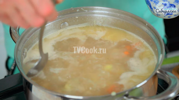 Переключаем плиту на огонь меньше среднего и снимаем образовавшуюся пену с закипевшего в кастрюле супа.