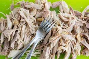 Когда курица будет готова, перекладываем ее на тарелку, быстро остужаем возле приоткрытого окошка и при помощи двух столовых вилок разбираем на волокна либо кухонным ножом делим на порционные кусочки желаемой величины. Огонь под кастрюлей увеличиваем до среднего уровня, кладем в бульон пюре из фасоли и размешиваем, так чтобы оно полностью растворилось.