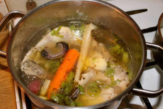Бросьте в бульон к курице морковь, корень петрушки и сельдерея, луковицу, чеснок, а так же лавровые листья, перец душистый горошком и смесь перцев, прованские травы и соль. Варите все вместе на медленном огне 15 минут после закипания.
