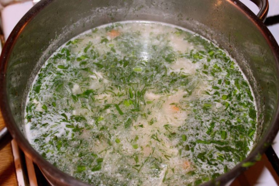 - Промойте укроп, очень мелко его нарежьте и так же добавьте в бульон.