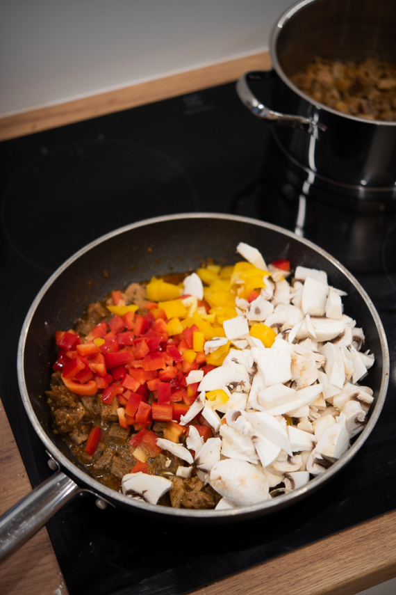 Подробный рецепт гуляша по-венгерски, в котором вы обжариваете мясо с луком, добавляете вино и специи, а затем тушите с овощами.