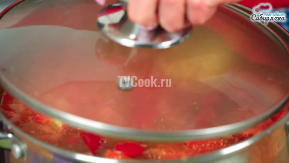 Нарезаем крупными кусочками 2 красных болгарских перца и выкладываем в общую кастрюлю.