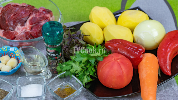 Подготавливаем необходимые продукты и специи для приготовления вкуснейшего супа-шурпа с бараниной и овощами.