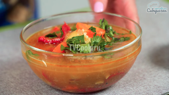 Перемешиваем все ингредиенты и продолжаем варить суп до полной готовности 5 минут, после чего добавляем в кастрюлю по вкусу смесь из молотых перцев.