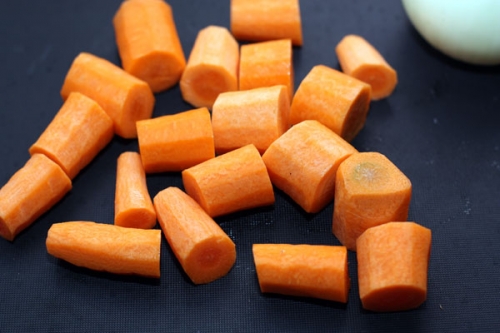- Как только вода закипит, снимаем шуму, убавляем огонь, добавляем один очищенный репчатый лук и морковь, нарезанную колечками, и варим в таком виде минут 20-30. В конце не забываем посалить по вкусу.
