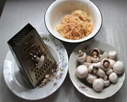Берем 500 грамм сырого картофеля и 500 грамм белых свежих шампиньонов. Промываем каждый ингредиент по отдельности под проточной водой. Мытый картофель чистим ножом от шкурки, вновь промываем и натираем на крупной терке в глубокую миску. Шампиньоны, перелаживаем на разделочную доску, при помощи ножа от ножек грибов отрезаем корневую часть и натираем чистые шампиньоны на крупную терку в глубокую миску.