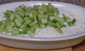 - Переходим к огурцам: тщательно помойте и очистите огурец от кожуры. Разрежьте его вдоль на две половины и ложкой удалите семена, оставив лишь мякоть. Нарежьте огурец на небольшие кубики и добавьте к приправленному йогурту. Хорошо смешайте все ингредиенты.