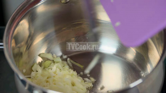 Выливаем в кастрюлю 2-3 ст.л. растительного масла и ставим ее на плиту, затем мелко нарезаем 1 головку репчатого лука и выкладываем его в кастрюлю, после чего перемешивая обжариваем его на большом огне плиты.
