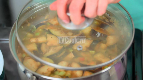 Средним кубиком нарезаем 1 баклажан и выкладываем в общую кастрюлю, затем перемешиваем все ингредиенты и продолжаем периодически перемешивая обжаривать овощи.