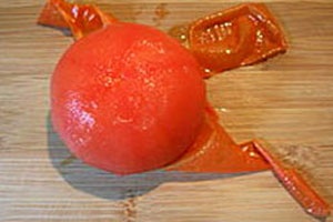 - Спустя 5–8 минут заливаем данный ингредиент кипятком из чайника и выдерживаем в нем 55–60 секунд. Затем перемешаем овощ в миску с ледяной водой и полностью охлаждаем. После этого обмакиваем томат бумажными полотенцами, снимаем с него кожицу, выкладываем мякоть на разделочную доску, нарезаем небольшими ломтиками либо просто делим на 6–8 частей и отправляем их в чистую посуду.