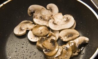 - Вымойте и нарежьте шампиньоны тонкими пластинками. Разогрейте растительное масло на сковороде и обжаривайте грибы около 5 минут.