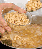 - Утром слейте воду с фасоли, залейте свежей водой и доведите до кипения. Добавьте крупно нарезанные лук и чеснок, а также лавровый лист. Зачерпните пену, посолите и поперчите. Варите на медленном огне под приоткрытой крышкой около 40 минут. Отложите треть фасоли, оставшуюся варите еще 10 минут, затем слейте и измельчите блендером до однородной массы.