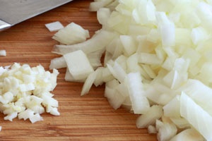 - Теперь снимаем с чеснока и репчатого лука шелуху, ополаскиваем их в воде, отправляем на разделочную доску и по очереди рубим небольшими кубиками размером до 5 миллиметров.