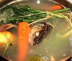 - Приготовьте бульон. В кастрюлю с холодной водой поместите хвосты, плавники и головы. Добавьте 1 корнеплод моркови, целую луковицу, перец горошком и лавровый лист. Доведите до кипения и варите на медленном огне 1 час. Процедите бульон.