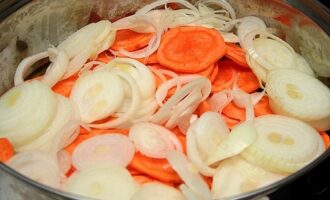 - Добавьте в кипящий бульон лук и морковь, нарезанные полукольцами. Следом отправьте очищенный и нарезанный картофель. Варите до готовности овощей, проверяя морковь, нарезанную тонкими кусочками.