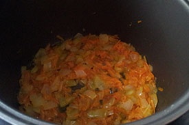 - В кастрюлю мультиварки наливаем небольшое количество оливкового масла и включаем режим «Жарка». Когда содержимое емкости хорошо разогреется, высыпаем сюда измельченный лук и морковную стружку. Время от времени помешивая деревянной лопаткой, обжариваем все в течение 10 минут.