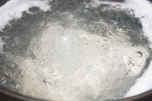 Затем отправляем курочку в глубокую кастрюльку, заливаем ее тремя литрами очищенной воды и ставим на средний огонь. После закипания при помощи шумовки снимаем с поверхности жидкости серо-белую пенку – свернувшийся белок. Затем уменьшаем огонь на уровень меду самым маленьким и средним. Прикрываем кастрюлю крышкой, так чтобы осталась небольшая щель, и варим бульон 25–30 минут, не забывая периодически удалять накапливающуюся пену.