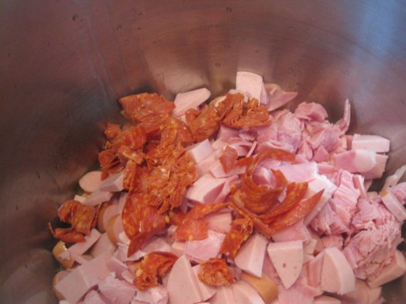 Все колбасные изделия лучше всего нарезать кубиками примерно одинакового размера.