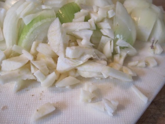 - Когда она станет золотистой, добавьте лук и продолжайте готовить, помешивая.