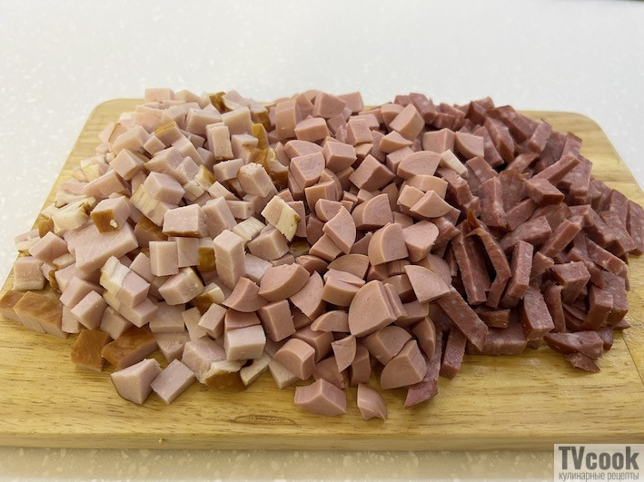 Из готового бульона достать мясо и кости дать ему остыть. Нарезать кубиками и отправить обратно в бульон. Следом добавить обжаренную колбасу и копчености.