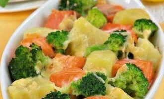Рецепт запеканки с рыбой и картофелем включает приготовление картофеля, бланшировку овощей и необычный кремовый соус.
